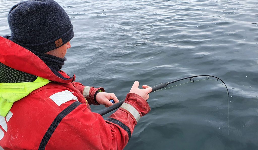 Vel framme sjekket vi drifta og posisjonerte båten for et forhåpentligvis godt drift. Det var Bilal som skulle få den første fisken. En meget anstendig førstefisk på ca. 8-9 kg. Vi veide den ikke, men persen til Bilal var på 9,12 kg, så det var ikke langt unna her. Vi kunne konstatere at steinbiten var på plass!