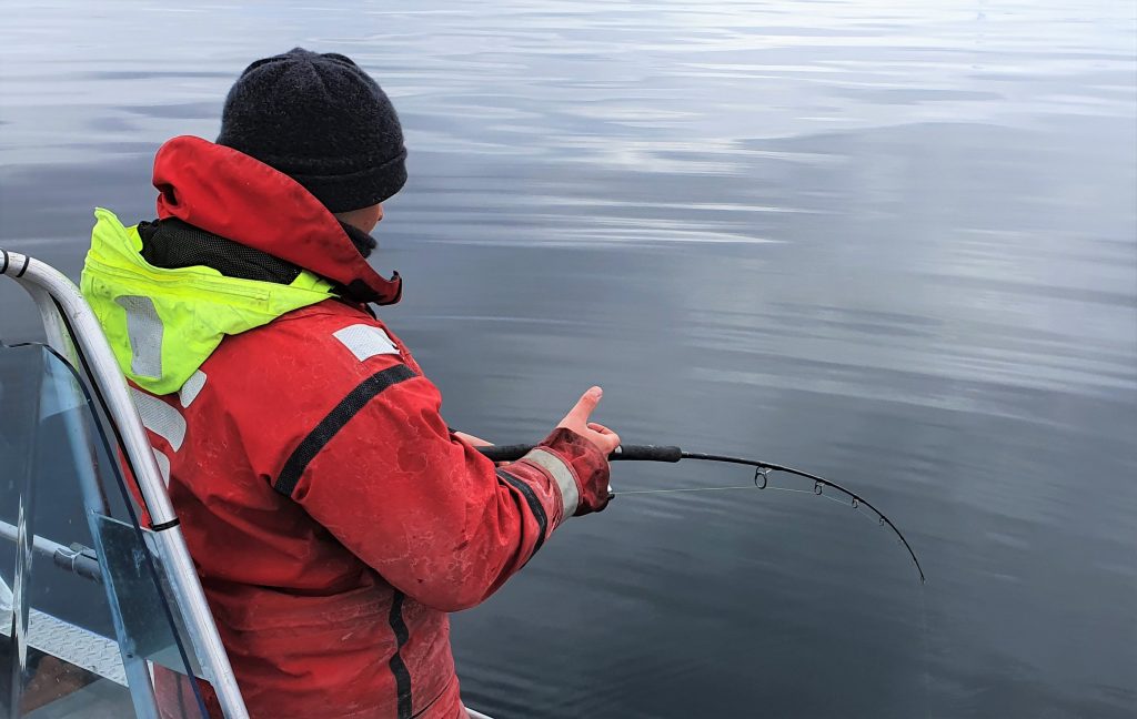 I år hadde vi også anskaffet en Rapala Combo Bag Rods/Weigh/Release. Den er fin for å bære kortere isfiskestenger i, men er også en perfekt veieslynge med glidelås for å veie fisk på en skånsom måte. Denne skulle vise seg å fungere perfekt for steinbiten.