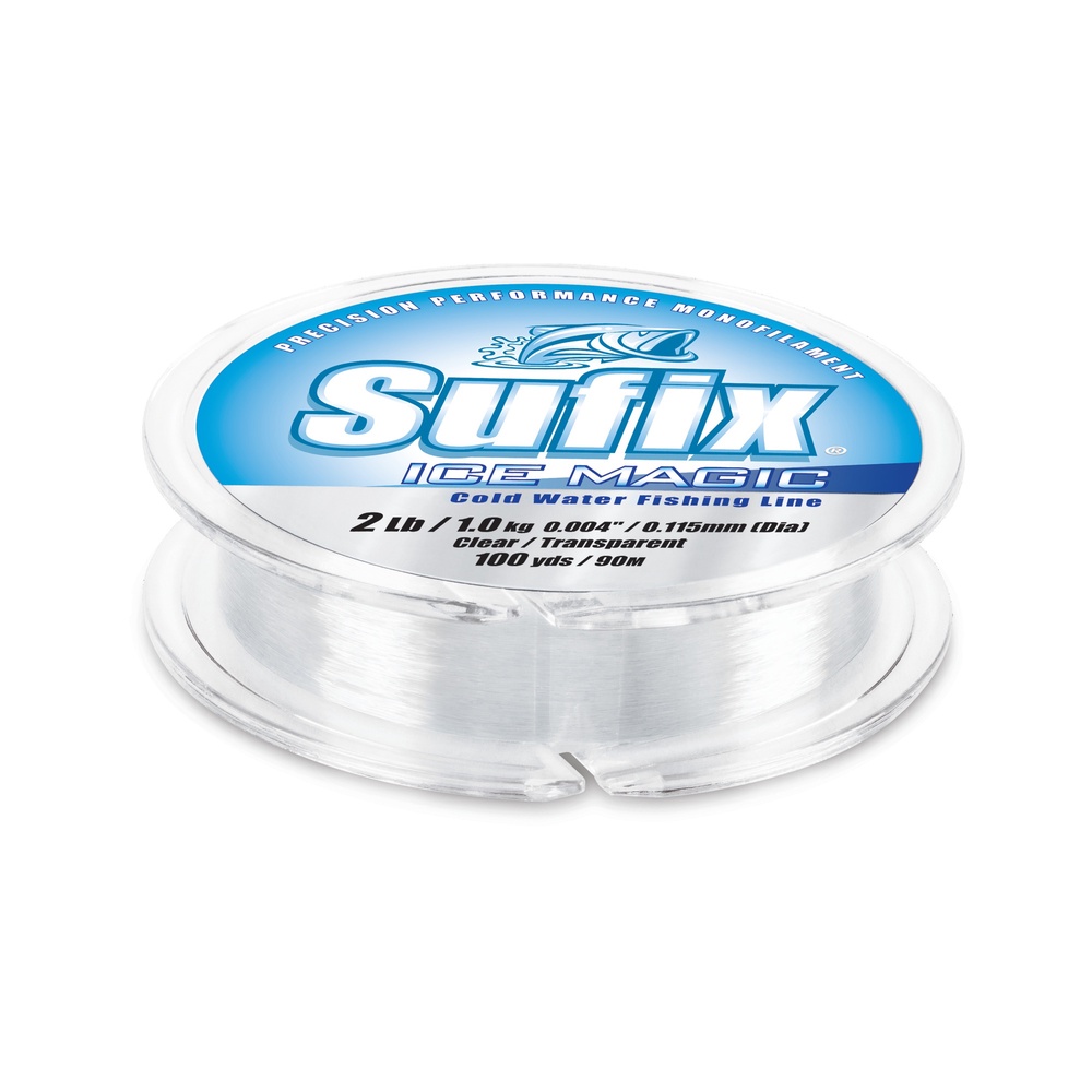 Klar isfiskesene fra Sufix, tilnærmet usynlig for fisken. Holder seg myk og smidig i kulde. Trekker ikke vann og fryser dermed ikke. Spolen kan klipses rett på Sufix Ice Rod combo.